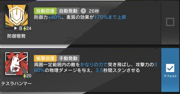 防御力アップ効果こそありませんが突き飛ばし・スタンの同時発動で前線の敵の行動を中断させられるため、時間を稼ぎたい時に活用すると非常に効果的。