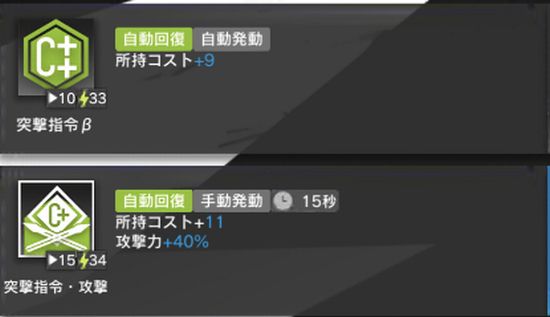 メインスキルとなる第2スキル『突撃司令・攻撃』の発動によりコスト回復・自身の攻撃力強化を同時に行えるのが特徴で、序盤のラッシュに強いのが長所。