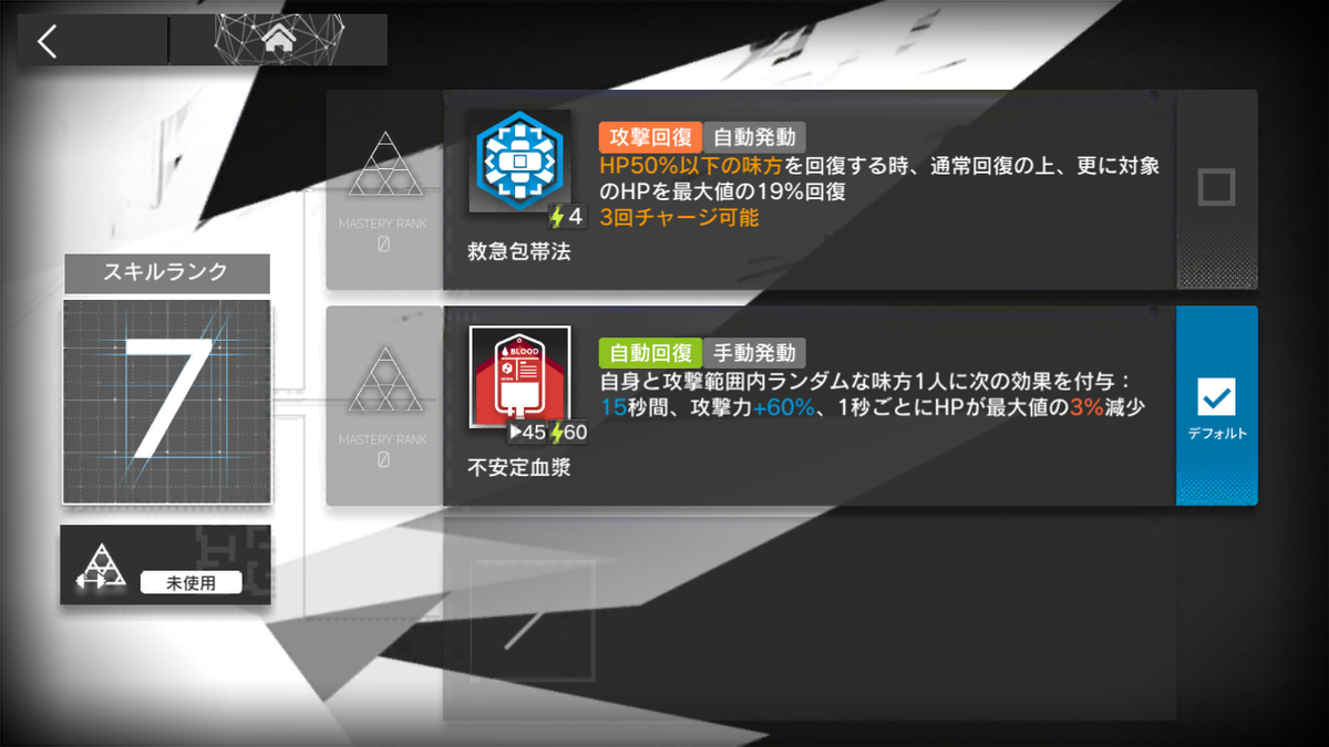 『不安定血漿』の攻撃力バフが不要な時や、重装オペレーターがもたない場合はこのスキルに頼るのも良いでしょう。