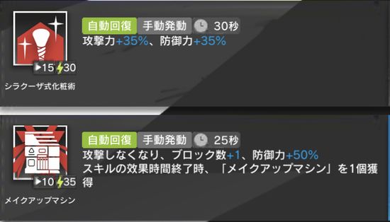 - 25秒間、攻撃しなくなり、ブロック数+1、防御力+80%。スキルの効果時間終了時、『メイクアップマシン』を1個獲得。
