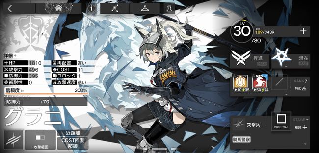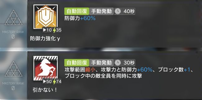 - 30秒間、攻撃範囲縮小(射程0)。攻撃力・防御力+80%、ブロック数+1、ブロック中の敵全員を攻撃。